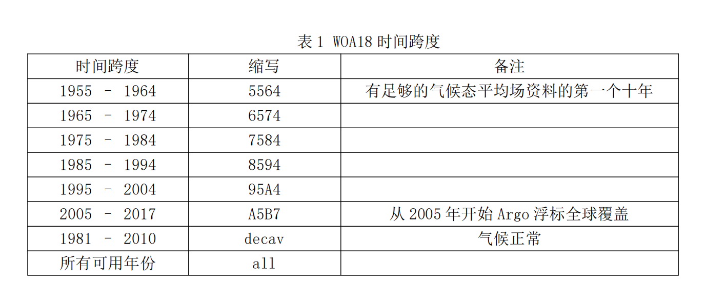 WOA 数据从 1994 年至 2018 年共发布过 7 个版本,分别为 1994、1998、2001、2005、2009、 2013 和 2018 版,新版本的 WOA 与 WOD 的每一次重大更新一起发布,其中 WOD 是世界上最大 的公开可用、格式统一、质量可控的海表以下海洋剖面数据集合。