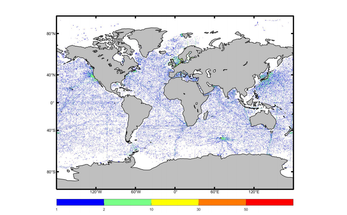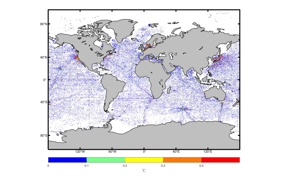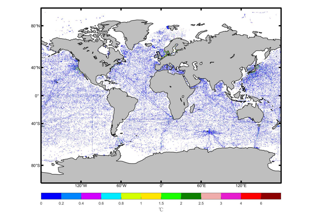 3.3 海表各网格温度 1/4°分辨率观测数量图像(Miller Cylindrical 投影) (2005-2017)