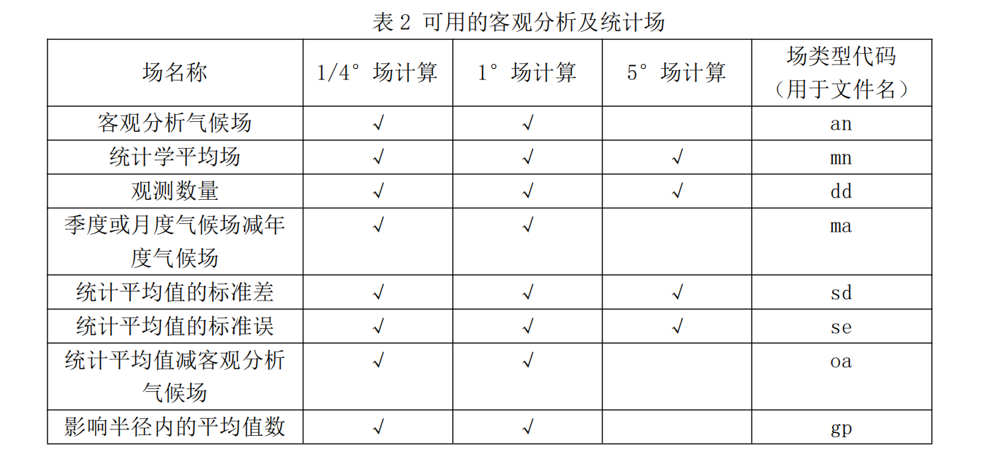 以下介绍网格分辨率、可用统计场的类型,以及这些变量的标准深度等级、时间跨度、 时间周期,以及文件的命名规则。