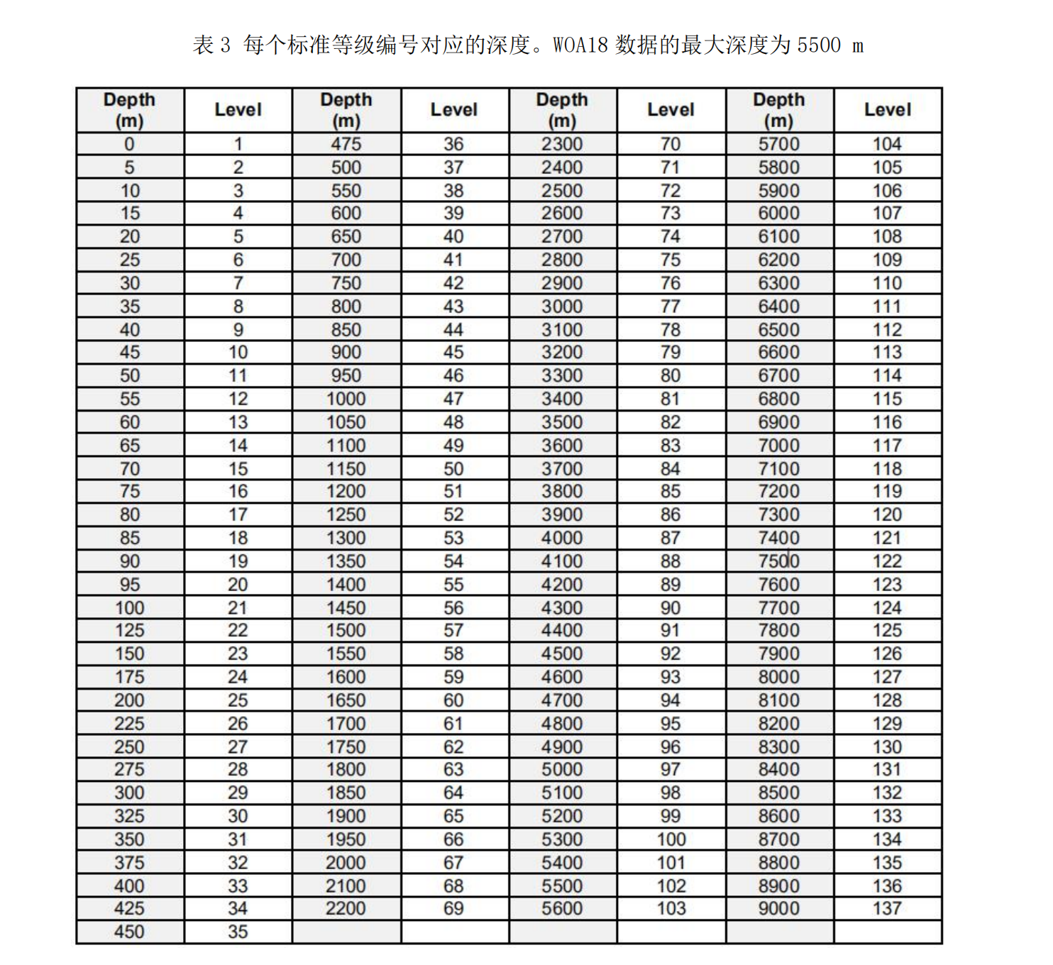 landsea_XX.msk 文件包含整个世界在每 1/4°2或 1°2处第一次遇到海底的标准深度 等级编号。Land 的值为 1,对应于海表面。表 3 列出了标准深度等级的数值。