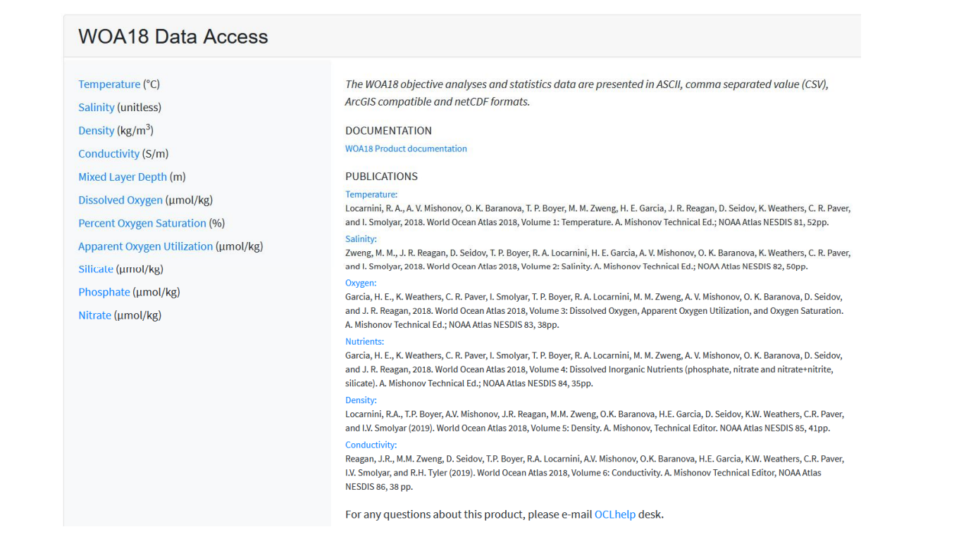 WOA18 提供数据和元数据的下载,以及选定区域对指定变量的图像进行在线预览。关于 各类数据的处理方法,见 WOA2018 的 Publications 板块。